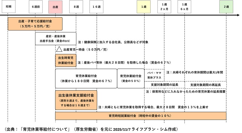 出産・育児を支援する給付金は、出産育児一時金や出産手当金などの健康保険からの支給で始まりましたが、その後、女性が産後も働き続けやすい環境整備のため、雇用保険から育児休業給付金が創設され、少子化対策の強化のために、この令和7年からさらなる給付金が創設されています。